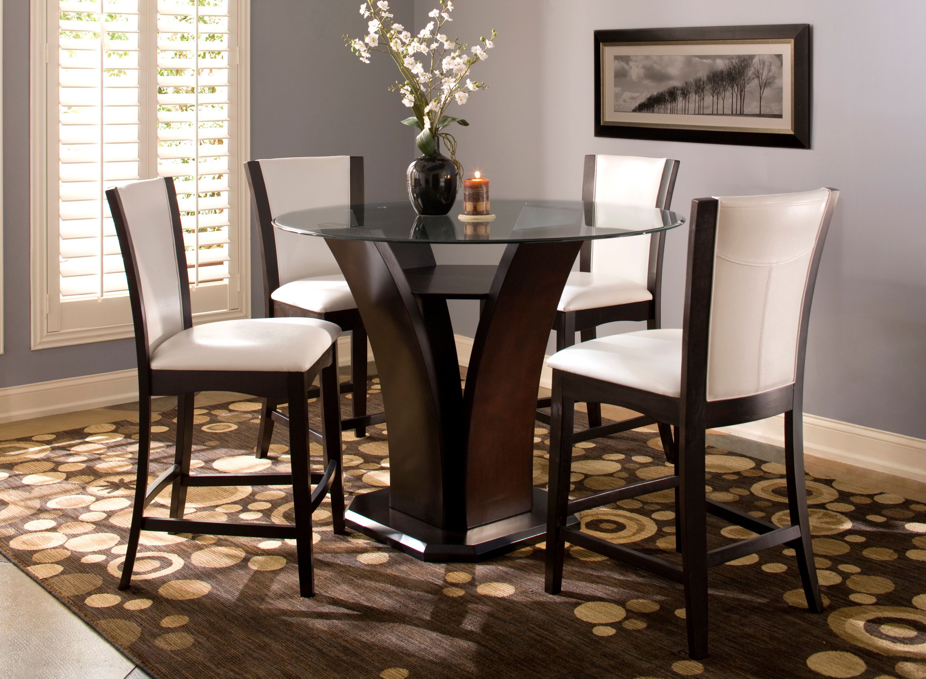 Transform your kitchen or dining room with the distinctive round glass dining table and chairs set.. A copper metal base features intricate details that contrasts beautifully with the coffee cushion upholstery on the coordinating chairs. ... Access Content